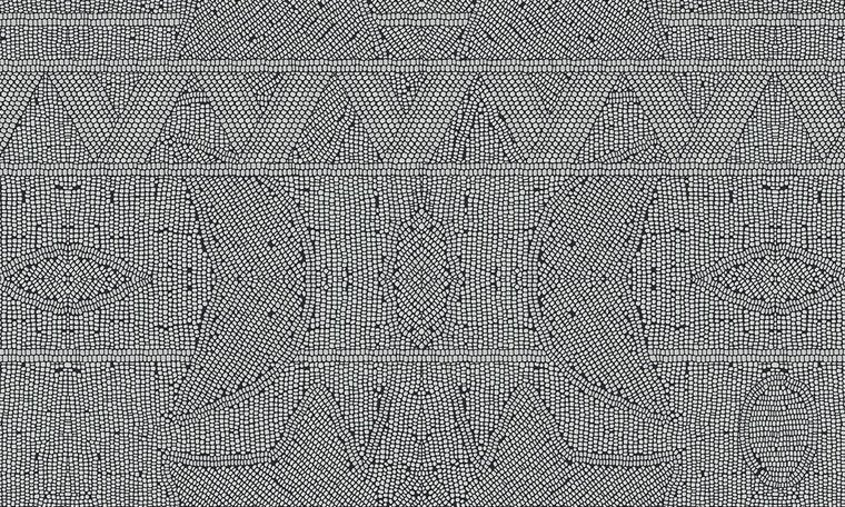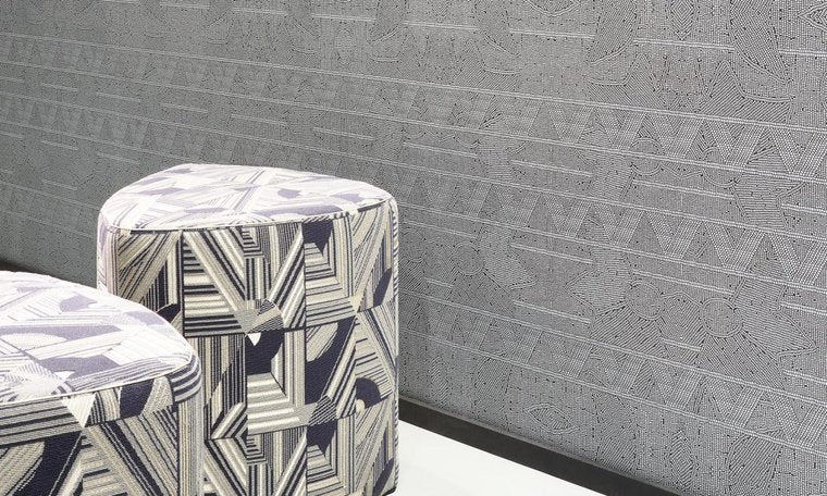 Hetzelfde ‘quillwork’ als dessin Civilia, maar dan met een uitgesproken motief. Het is precies gemaakt zoals de Paleo Indianen het al deden, gestileerde figuren uitgekerfd in hout, steen of been. Uit opgravingen weten we ook dat ze dol waren op gekleurde materialen zoals koraal, turkoois en jade, tinten die je ook in deze collectie aantreft.