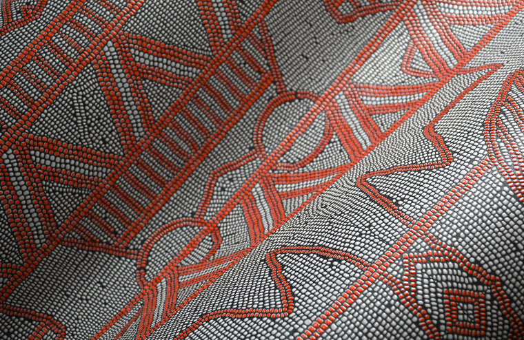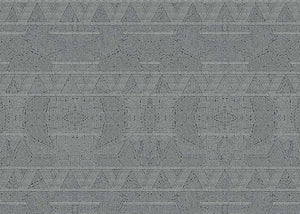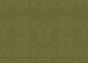 Hetzelfde ‘quillwork’ als dessin Civilia, maar dan met een uitgesproken motief. Het is precies gemaakt zoals de Paleo Indianen het al deden, gestileerde figuren uitgekerfd in hout, steen of been. Uit opgravingen weten we ook dat ze dol waren op gekleurde materialen zoals koraal, turkoois en jade, tinten die je ook in deze collectie aantreft.