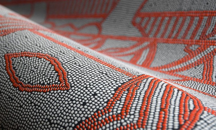 Hetzelfde ‘quillwork’ als dessin Civilia, maar dan met een uitgesproken motief. Het is precies gemaakt zoals de Paleo Indianen het al deden, gestileerde figuren uitgekerfd in hout, steen of been. Uit opgravingen weten we ook dat ze dol waren op gekleurde materialen zoals koraal, turkoois en jade, tinten die je ook in deze collectie aantreft.