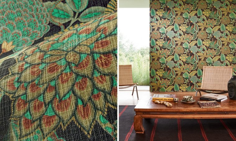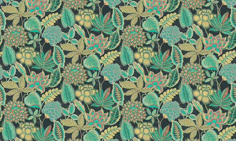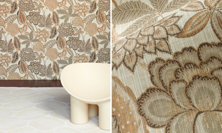 Dit verfijnd patroon toont een gedetailleerde, florale print. Het haalt haar inspiratie uit vintage stoffen, welke een rijkelijk gevoel geven. Deze frivole tekening komt tot haar recht door het linneneffect en subtiel metaalaccent.
