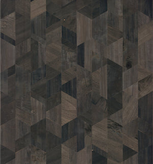 Zeshoekige vlakken die als mozaïeken ingevuld zijn, met verschillende houtfragmenten, contrasterende kleuren en wisselende vormen. Soms in lijn, soms haaks op elkaar ingelegd. Zo ontstaat er een speels en ritmisch geheel waar je nu eens diepte in ziet en dan weer volume.