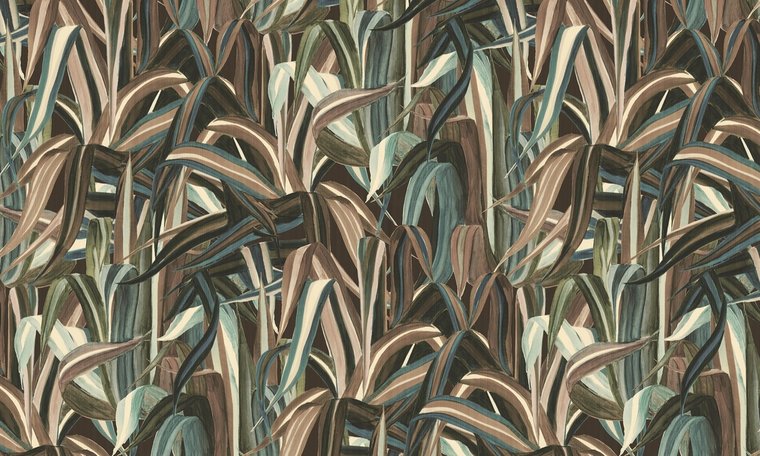 Een uitbundig botanisch design van tropische bladeren met het gevoel van een handgeschilderde muurbekleding. Gedrukt in levendige kleuren op een fil-à-fil van jutedraden. Deze geven een ongekende diepte en bijzonder natuurlijk aspect aan de muur.
