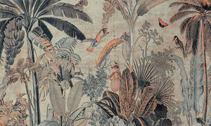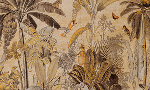 Een paradijselijk tafereel dat heerlijk doet wegdromen. Kolibries, papegaaien en aapjes leven harmonieus samen in het land van melk en honing. Dit panorama is geprint op een look van perkamentpapier voor een niet te evenaren vintage-effect.