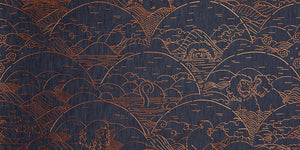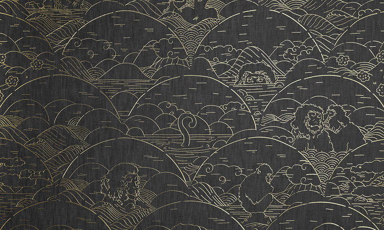 Textielmuurbekleding vervaardigd uit denim, met gekleurd borduurwerk. Het patroon op de Indigo Macaque-muurbekleding toont een vrolijke scène van Indigo Macaque-families, terwijl zij op hun favoriete plaats in een ontspannen sfeer aan het baden zijn: de warmwaterbronnen aan de voet van de Japanse bergen.
