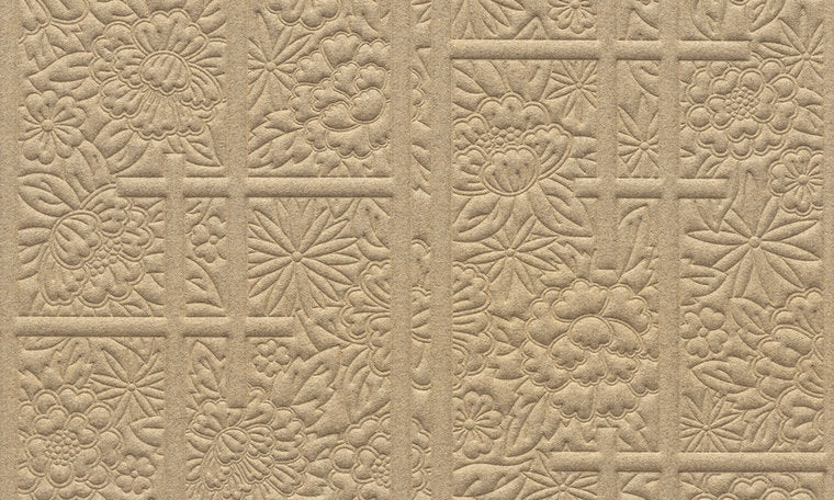 Symbolische kersenbloesems en rechte lijnen lijken op de minimalistische uitstraling van de Japanse shojischermen. Tegenover het sterke contrast van de roze tinten op het doorzichtig washipapier straalt deze monotone, 3D-muurbekleding, vervaardigd uit denim of vervilte wol, rust uit.