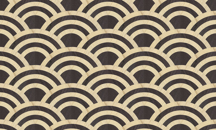 Overlappende O’s, gecreëerd met inlegmozaïek van houtfineer, lijken op rollende golven in de oceaan. Het klassieke seigaihapatroon van de unieke muurbekleding dat watergolven symboliseert, stelt geluk, kracht en veerkracht voor.