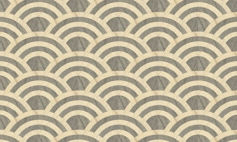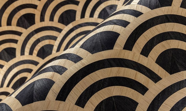 Overlappende O’s, gecreëerd met inlegmozaïek van houtfineer, lijken op rollende golven in de oceaan. Het klassieke seigaihapatroon van de unieke muurbekleding dat watergolven symboliseert, stelt geluk, kracht en veerkracht voor.