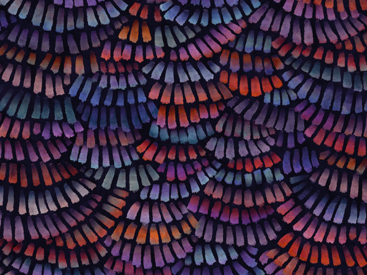 Deze muurbekleding uit geplooid textiel is geïnspireerd op de unieke kleur en waaiervormige vleugels van de Dandelion Crane. Het tactiele dessin is het resultaat van gevouwen textiel in een patroon dat doet denken aan gevederde waaiers.