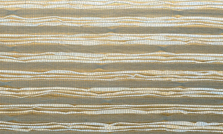 Een combinatie van raffia en ruwe draad, onregelmatig ingeweven om het natuurlijke karakter extra in de verf te zetten. Beide matte materialen contrasteren mooi met de metaalkleurige of gelakte ondergrond.
