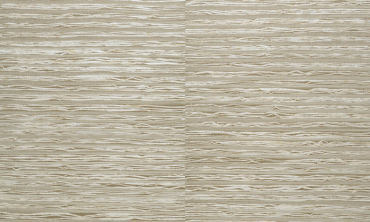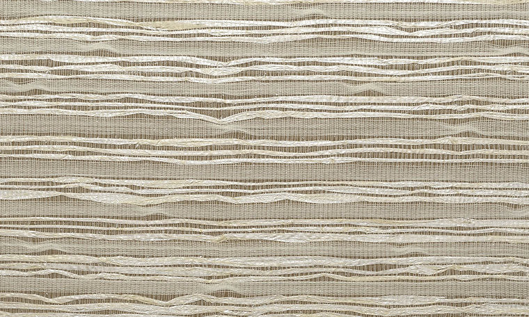 Een combinatie van raffia en ruwe draad, onregelmatig ingeweven om het natuurlijke karakter extra in de verf te zetten. Beide matte materialen contrasteren mooi met de metaalkleurige of gelakte ondergrond.