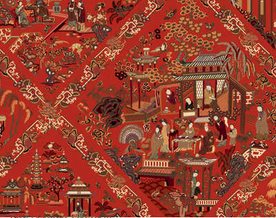 Braquenie L'Empire Du Milieu wallcovering shows a exotic design reproduces the four scenes on a rare shawl embroidered in China for the Western market around 1880, which we are fortunate enough to have preserved in our archives. The taste for chinoiserie that began to appear in the 18th century shows no signs of waning.