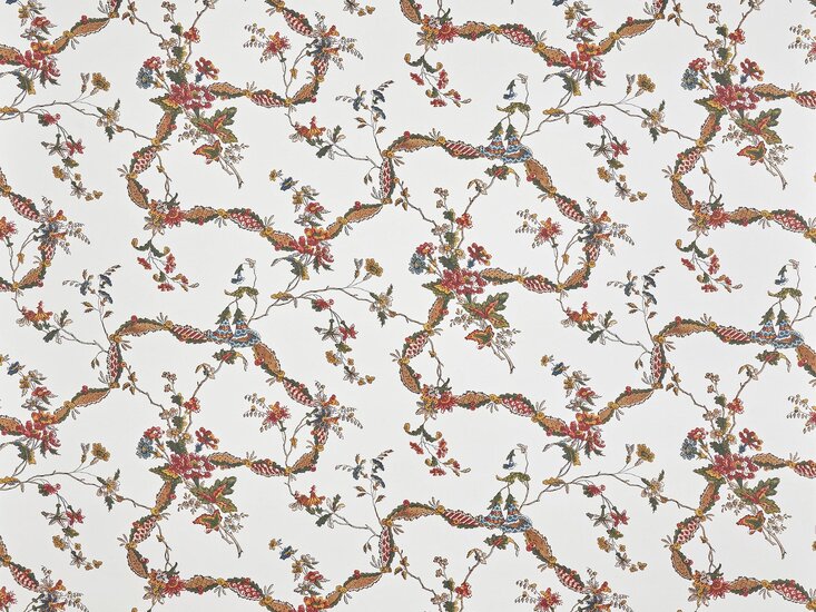 Braquenie Mirande Behang is versierd met linten die subtiel met bloemen zijn verweven. Het dessin is een herinterpretatie van een canvas dat rond 1789 met de blokdruktechniek is bedrukt door de Woolmer Collins-fabriek in Engeland, bewaard in de archieven van Maison.