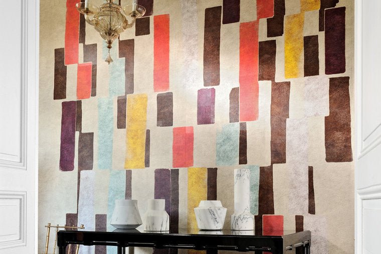 De structuur van het ÉLITIS Tribeca behang is die van vacht, aan elkaar gezet als grote stukken canvas. Waar kunstenaars een prachtig abstract kunstwerk op hebben gecreëerd. Dit panorama behang wordt als paneel verkocht en is daarmee extra breed.