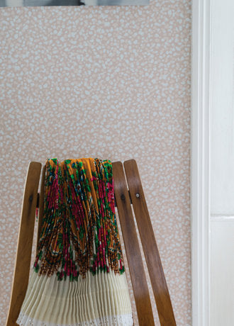 Het behang Farrow and Ball Blotsma toont het speelse spel van bloemblaadjes die door de wind worden opgenomen en weggeblazen. Delicate bloessem in een wervelend dessin.
