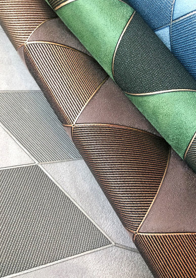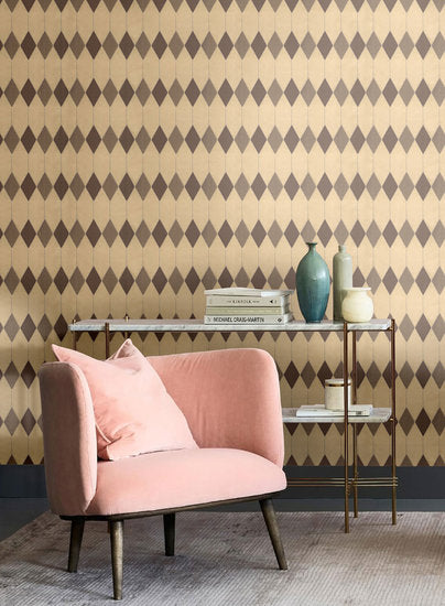 Greenland Pursuit Diamond Behang is een zeer bijzonder behang gemaakt van 100% suède. Een echt luxueus behang met een uniek design! Het behang heeft een geometrisch patroon van met metallic gouddraad geweven ruiten, waardoor het geheel een unieke combinatie wordt van stoffen en texturen met een prachtige gouden glans.