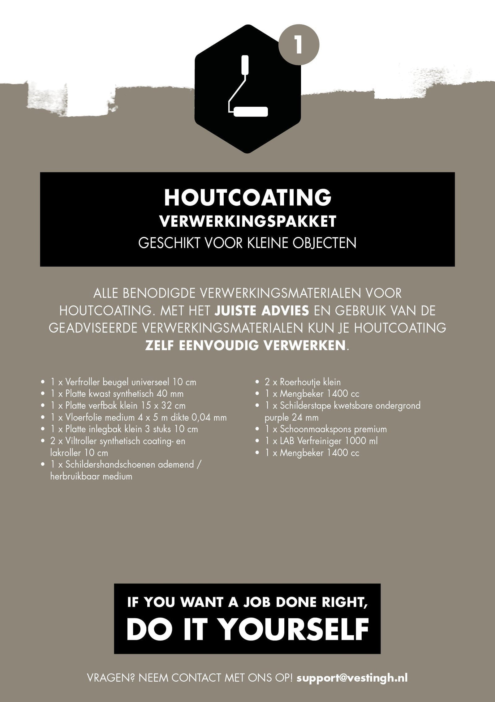 Het houtcoating verwerkingspakket bevat alle benodigde verwerkingsmaterialen voor het aanbrengen van houtcoating. Met het juiste advies en gebruik van de geadviseerde verwerkingsmaterialen kun je houtcoating zelf eenvoudig verwerken.