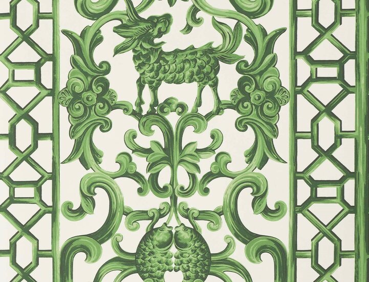 Jim Thompson Xanadu behang is een gezeefdrukte muurbekleding. En het ontwerp is afgeleid van een van de vele gebeeldhouwde Chinese deuren in Tony Duquette's Beverly Hills huis, Dawnridge.