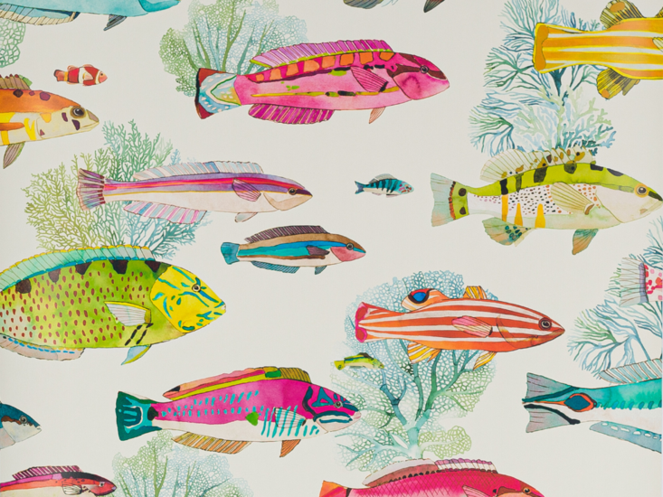Manuel Canovas Fidji behang is een prachtig tropisch behang met vissen. Zonovergoten tropische riffen zijn prachtig vastgelegd in deze handgetekende afbeelding van een school vissen die tegelijk zwemt. Meesterlijk digitaal geprint als behang om de details van penseelstreken te accentueren.