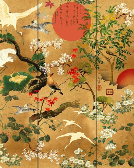 Vroeger werden dit soort kamerschermen op een ondergrond van thee papier, zijde of bladgoud geschilderd. De ondergrond van dit behang is van papier dat lijkt op goud. Daarnaast is er ook een versie gemaakt van een metallic folie papier.