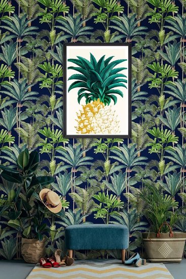 Mind the Gap Palmeras behang haalt de natuur in huis. Een behang met botanische palmbladeren. Een exotisch ontwerp, op een zwarte achtergrond, met indrukwekkende palmbomen, die een tropische sfeer creëren in elke omgeving.