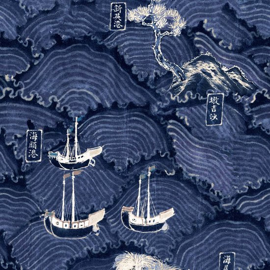 Het Mind the Gap Waves of Tsushima behang creëert het gevoel van een oud Japans houtsneden-design. Geïnspireerd door antieke kunstwerken gemaakt met deze traditionele methode, toont het behang denkbeeldige golven, boten en bomen in diepe indigo tinten.