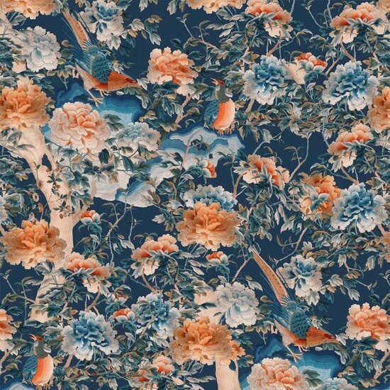 Het Mind The Gap A Manchurian Night Behang toont gedetailleerde bloesems, in een prachtige compositie vastgelegd. Het patroon herleidt zachte bloemige vormen tegen een intens blauwe achtergrond. Perfect voor artistieke en kostbare interieurs, dit behang roept het magische gevoel van de Chinese natuur op.
