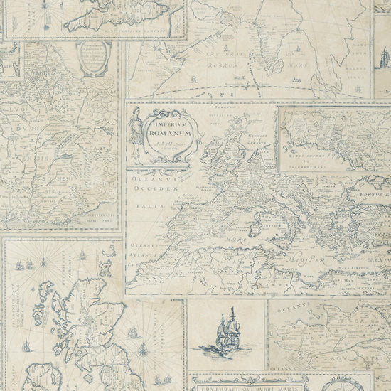 Dit Mulberry Home Bohemian Travels behang is een uniek behang waarop verschillende kaarten worden gecombineerd. Zo zien we bijvoorbeeld een prachtige kaart van het Midden-Oosten en India die gemaakt is rond 1700, en een kaart van het Romeinse Rijk die gemaakt is in de zeventiende eeuw. Een prachtig staaltje geschiedenis met de originele Latijnse namen en figuren. Deze kaart is uitgevoerd in ecru met indigo bedrukking.