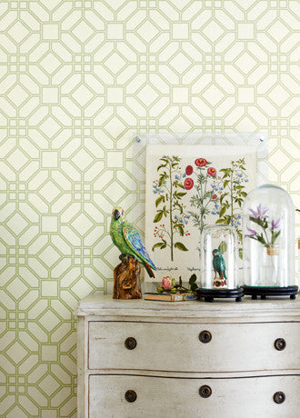 Het Zoffany Veranda Trellis behang heeft een geometrisch patroon, afkomstig uit het begin van de 20e eeuw.Collectie: Zoffany Woodville behang